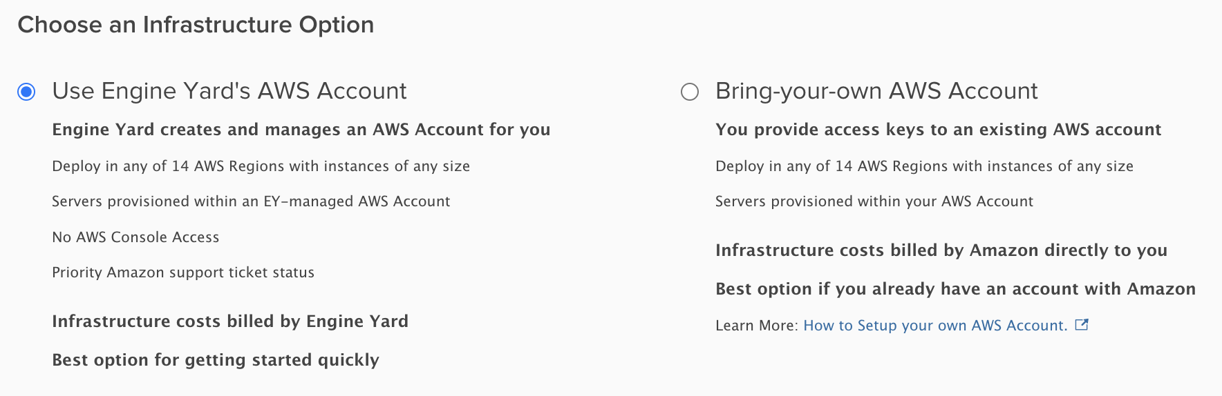 5. Choose Use Engine Yard's AWS Account to be allocated a new, private, AWS account from Engine Yard's reserved pool and pay for infrastructure as part of your EY bill, or Bring-your-own AWS Account in order to utilise your own pre-existing AWS account with your EY account and continue to pay AWS directly for infrastructure.
