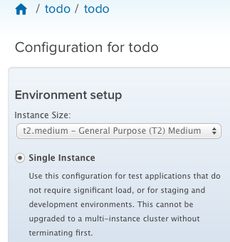 NOTE: As this environment is for sample application, single instance is selected. You may select the instance size that you wish for your application to run from the configuration screen.