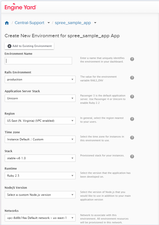 On the 'Create New Environment' page shown above, enter a name for your Environment.