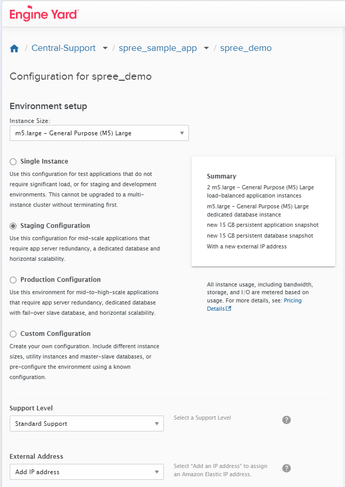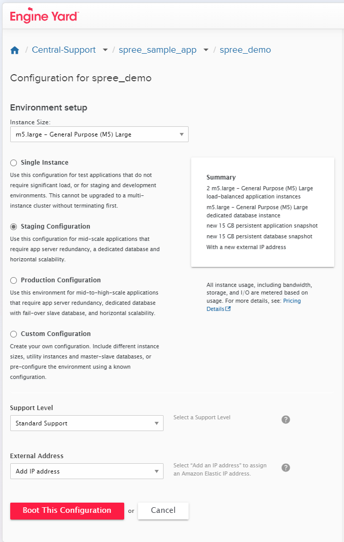 Now you have a chance to define the cluster configuration for this environment. Go ahead and choose a Staging Configuration to take advantage of app server redundancy and dedicated database instances. After this, feel free to experiment with different options Engine Yard recommends or spin up your own.