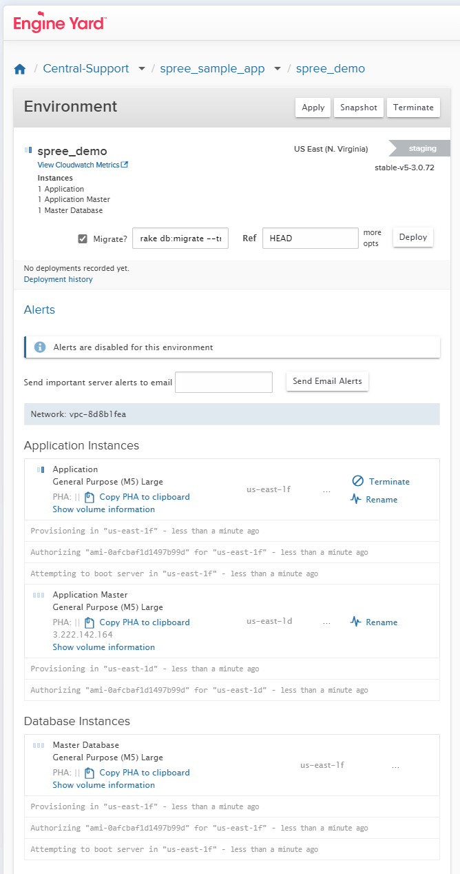 Engine Yard works behind the scenes to start up the environment, configure and provision the instances, and finally deploying the app. Configuring the environment and spinning up the instances for the first time will take about 15 minutes.