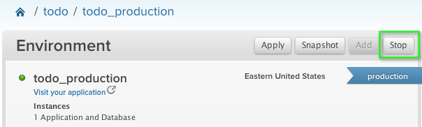 When you are ready, go to your dashboard and click the Stop button associated with the environment you are planning to upgrade.