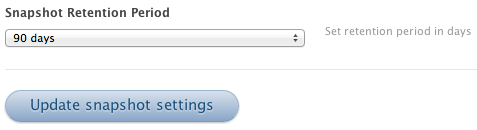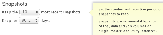 • Snapshot retention period in days, for this environment. Engine Yard will delete snapshots after the specified number of days for all snapshots related to any instances associated with this environment.