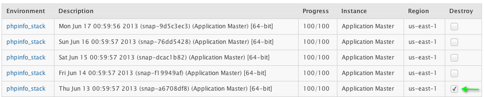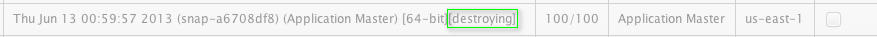 Engine Yard immediately begins deleting the selected snapshots and displays [destroying] at the end of the snapshot description.