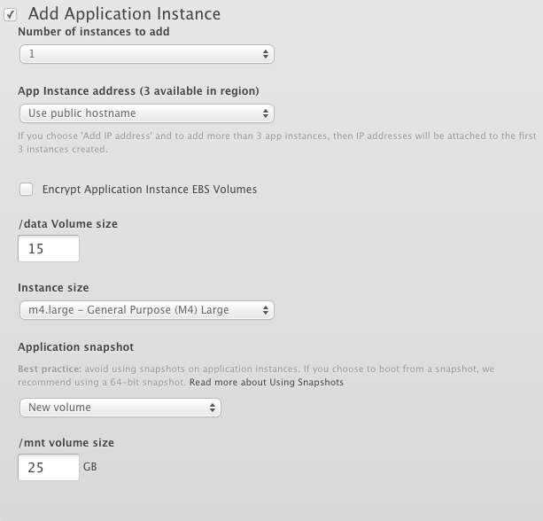 Note: The Instance Type selection used to be a radio button that forced you to choose only one among "Add Application Instance", "Add Database Replica", and "Add Utility Instance". As of this writing (July 4, 2017) these radio buttons have been changed to checkboxes and it is now possible to add different instance types at the same time. For example, you can add 3 application instances, one or more utility instances, and a database replica at the same time.