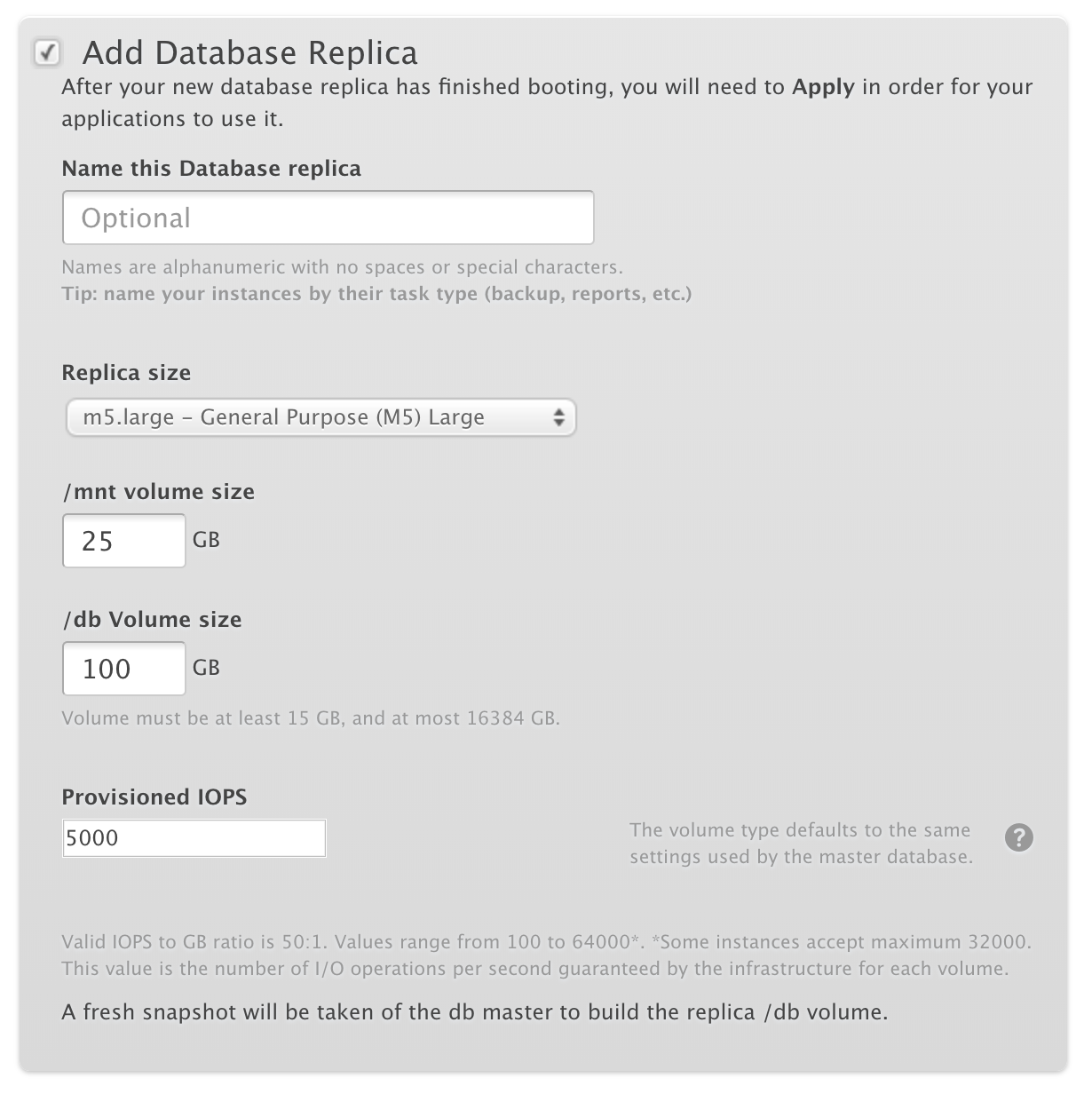 - When you create a new environment, you cannot set the provisioned IOPS value for a database replica, its value automatically matches the database master.