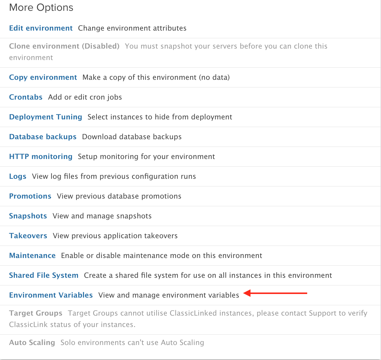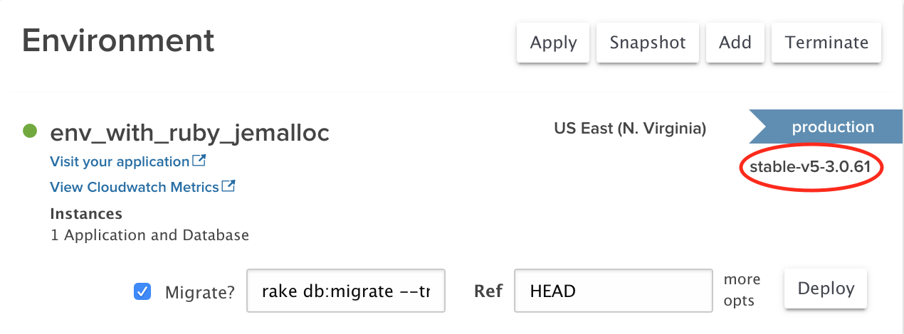 [Required for stable-v5 environments only] Navigate to the environment you want to enable Ruby with jemalloc for and ensure the stack version is at least stable-v5-3.0.61, if not, Upgrade the environment. Also make sure that the Ruby version is 2.4 or above, if not you will need to Edit your environment and change the Ruby version, after thorough application testing in a local deployment and EY staging environment.