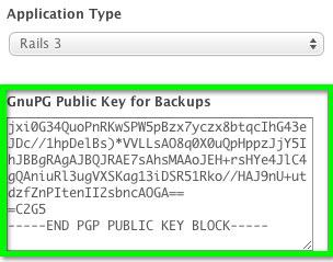 Important: Once encrypted backups are enabled they will be encrypted using a PGP key pair. The public key will be used to encrypt the backup, whilst the private key is required for decryption. The private key will be unknown to Engine Yard and is the sole responsibility of the customer to store. We recommend storing the key in multiple secure locations, with a passphrase enabled, that being also recorded in a separate secure location. Without this key and passphrase it will not be possible to decrypt the DB backups.