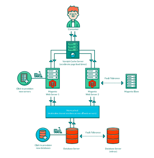 Scaling Magento is where we look at creating a distributed infrastructure, separating some of the moving parts, allowing us to easily scale up as traffic/demand increases. Traditional setups, where Magento runs on a single server, make it difficult to scale like this.