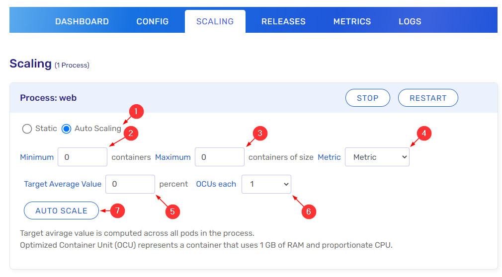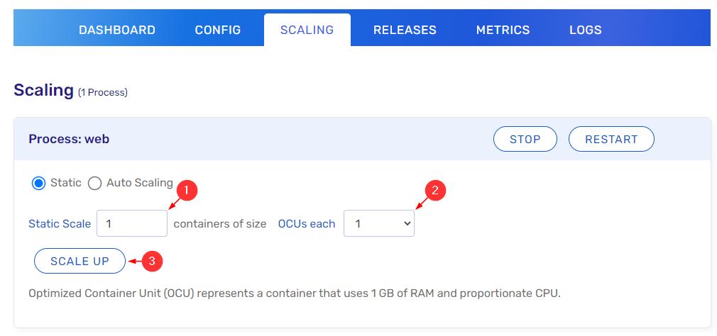 Your applications can be scaled based on the Process Type. Scaling can be static, defining a fixed number of Optimized Container Units (OCUs), or automatic, defining a set of parameters where the application will increase or decrease the number of OCUs available to handle requests. One OCU represents a Container that uses 1GB of RAM and a proportionate CPU.