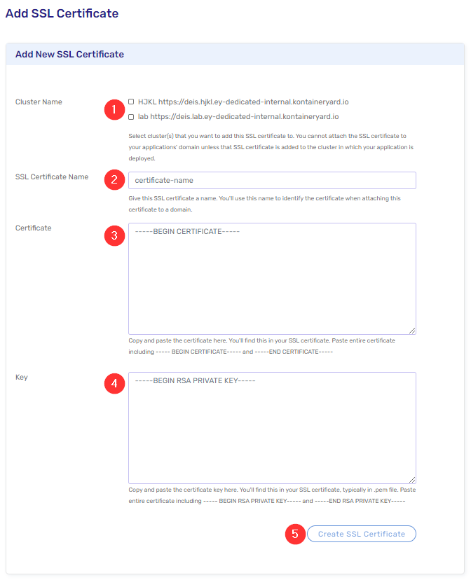 - Certificate: Copy and paste your plain text SSL certificate starting with